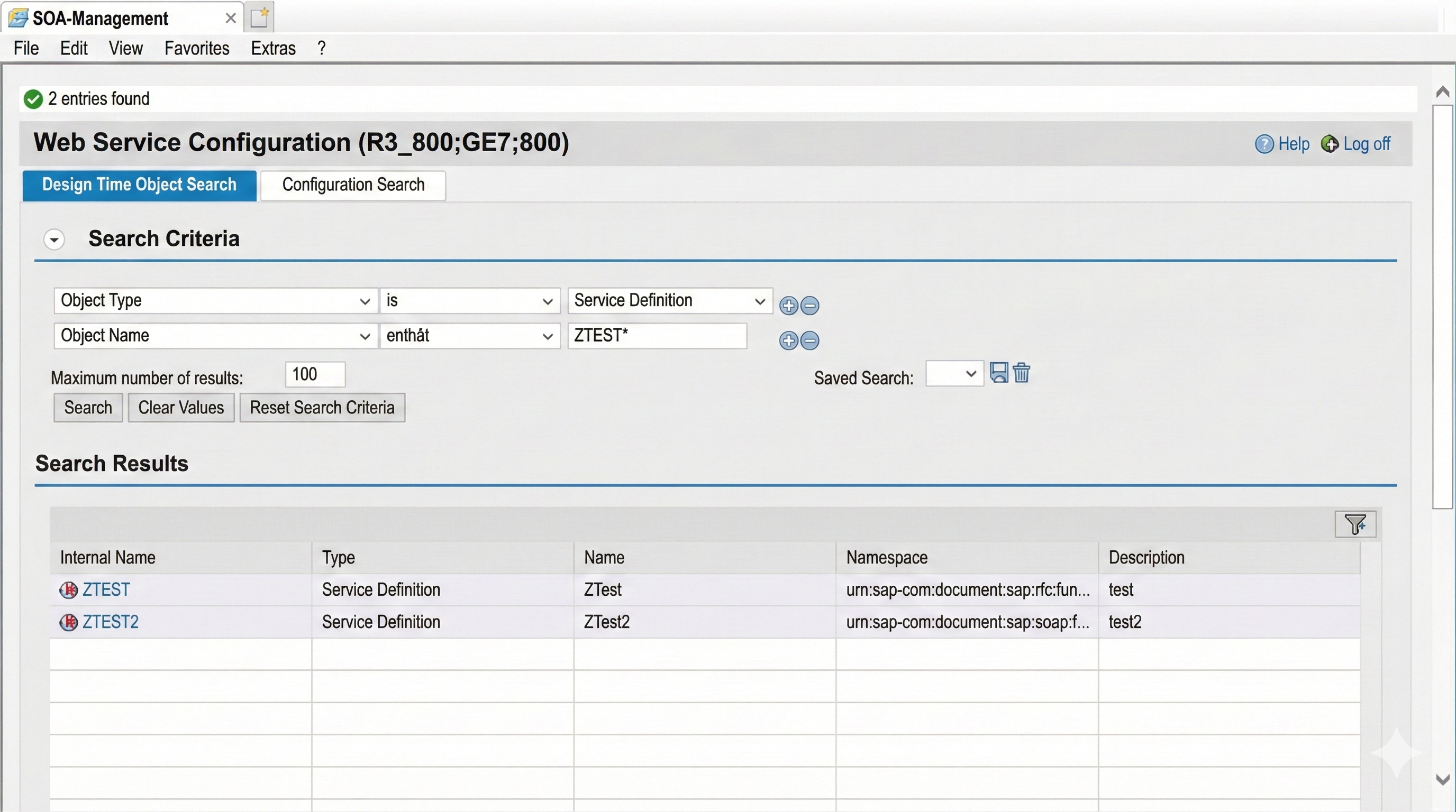 After selecting "Web Service Configuration," the service to be configured can be selected via a search for the object type "Service Definition" and the corresponding object name.