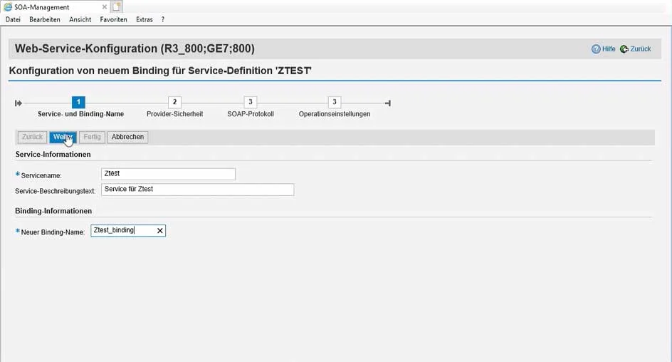 Fig. 1: Entry of the service name and name of the binding (usually with the suffix "_binding")